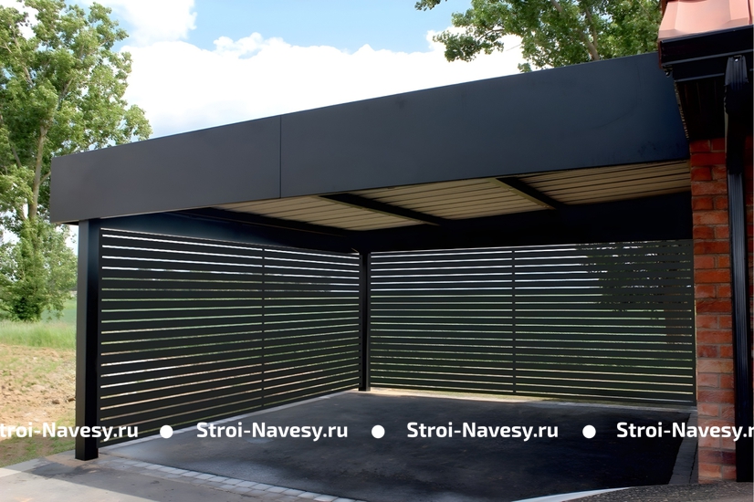 Современный односкатный навес в стиле high-tech из профлиста с боковыми панелями для автомобиля
